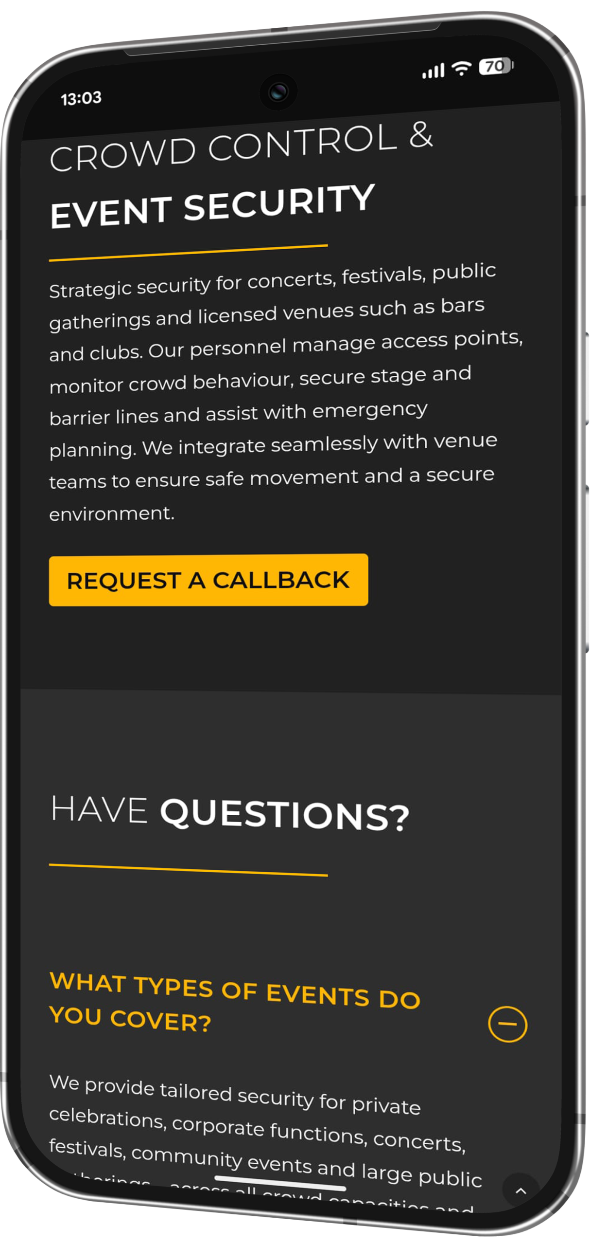 I designed and built the full website across five service pages: Close Protection, Event/Crowd Control, Static Protection, Risk & Security Consulting, and Process Serving. Every page was structured to inform, build trust, and convert enquiries.